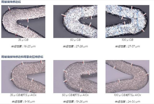 經過吉川公司工藝工程師測試,用氧化鋁砂進行定向的噴砂處理可以去除氧化層,平滑表面缺陷并改善外圍支架的表面質量。支架的受損區(qū)域很脆,但基礎材料鎳鈦諾卻具有延展性。氧化鋁噴砂磨料使用去氧化層,并且對韌性基體的侵蝕最小,從而在支架撐桿的整個長度上形成均勻的表面光潔度。 市場最新的支架設計和醫(yī)療植入物要求更大的邊緣倒圓角。圓形邊緣降低了被植入物卡住,其他風險的可能性。氧化鋁微噴丸的半徑為5-15 m,但新的幾何尺寸指定為接近25 m。該半徑可以通過三種途徑實現(xiàn):延長噴砂周期,使用更大尺寸的氧化鋁或完全使用其他磨料。通過測試,我們了解到更長的噴砂周期可以去除更多的團塊,而較大尺寸的氧化鋁會產生過于粗糙而無法拋光的表面。畢竟,氧化鋁顆粒的形狀為塊狀,邊緣稍尖。這給了我們一個可行的選擇:嘗試使用其他類型的磨料。為了克服這一障礙,我們測試了幾種類型的介質,發(fā)現(xiàn)用玻璃珠噴砂可以在拐角處形成所需的半徑(最大30 m),而不會除去設備的額外質量。結果是氧化鋁的質量提高了十倍。經過吉川公司工藝工程師的測試事實說明了結果的差異。用氧化鋁噴砂處理過的樣品的半徑僅為8-13 m,而用玻璃珠噴砂處理過的樣品的半徑為24-30 m。 經過吉川公司工藝工程師最終測試事實證明,最好的心臟支架噴砂工藝需要用氧化鋁砂粗噴砂、再用玻璃珠微噴砂是目前最好的一種噴砂工藝方式。 經過粗噴、微噴的產品外徑和內徑轉角處的半徑可以實現(xiàn),而所需的附加材料去除最少。半徑的大小可以有效地控制,因為它是基于圓形磨料,玻璃珠的大小和速度的。可以控制具有附加半徑的支架區(qū)域。通過機械加工表面,有助于保持支架的疲勞壽命。玻璃珠磨料通常用于必須保持嚴格公差的噴丸處理應用中。玻璃珠對支架表面進行噴丸處理,不會去除任何材料或數(shù)量可忽略不計的材料。如下所示,玻璃珠的尺寸很重要。玻璃珠的尺寸越大;邊緣越圓。玻璃珠有35 ,50 和100 兩種。讓我們看一下使用每種尺寸的樣本測試的結果。此處顯示的未噴砂的支架表面(500x)邊緣鋒利,并受到制造損壞。半徑范圍僅為3-8 m。為什么用兩種磨料處理比單獨用氧化鋁處理好? 玻璃珠無法消除制造過程中產生的浮渣,回彈和其他損壞;只有氧化鋁可以。氧化鋁不能產生真正的圓形邊緣。但是,它確實可以提供電拋光所需的理想表面光潔度。一個不能替代另一個。通過使用多步驟過程,植入物表面可以使用經過驗證的相同設備獲得兩全其美的效果。在該過程中添加第二種研磨劑聽起來可能需要更多的勞動力,但實際上比其他修邊過程更有效。例如,電拋光可以產生較大的半徑,但它也會從整個零件中去除過多的材料,而不僅僅是角部,從而損害了支架的疲勞壽命。